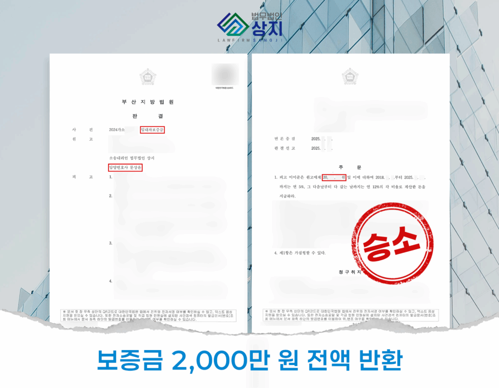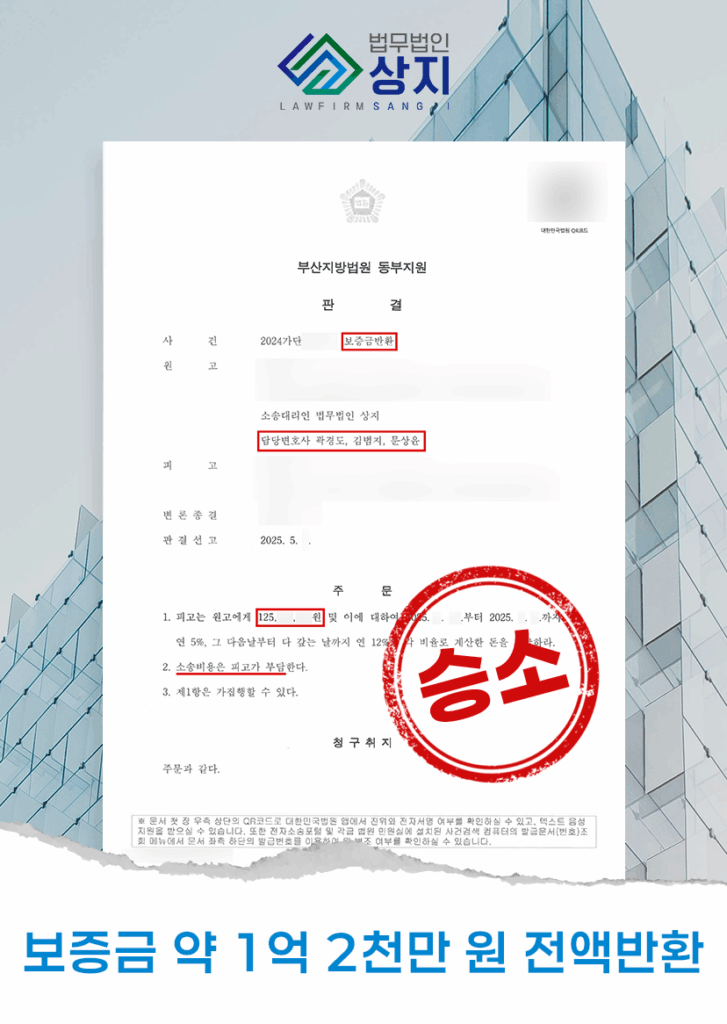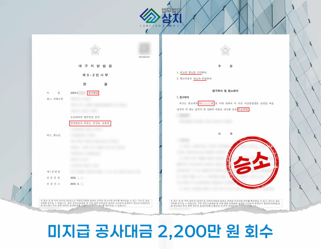 Services 건설/부동산 공사대금청구 2심 승소 (2천 2백만 원 지급, 건설업면허 대여 후 재하도급 사례) 안녕하세요. 건설전문 곽경도 대표와 함께하고 있는 건설분쟁 특화 법무법인 상지입니다. 해당 글에서는 건설업면허 명의대여 후 재하도급을 한 사안에 대해서 '명의대여자'에게 공사대금을 청구하여, 항소심(2심)에서 승소한 소송사례를 소개해 드립니다. Explore 임대차보증금 반환소송 사례 (2억 6천만 원, 부산지방법원 동부지원) 의뢰인께서는 부산 수영구 위치한 오피스텔 보증금 2억 6천만 원을 돌려받지 못해 신속한 민사소송 진행을 요청 주셨습니다. Explore 보증금반환소송 업무사례 (약 1억 2천만 원, 부산지방법원 동부지원) 의뢰인께서는 오피스텔 보증금 1억 2천만원 가량을 돌려받지 못해 신속한 민사소송 진행을 요청주셨습니다. Explore 건설/부동산 Get In Touch